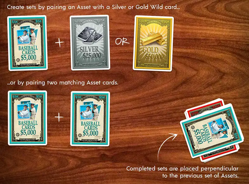 One pair of asset cards from your hand can be placed face up in front of you. A pair consists of either two matching asset cards, or an asset card with a wild card tucked behind it (the gold and silver cards are the wild cards).