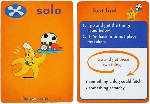If your team rolls a SOLO, you and your teammates do the challenge on the card together. The other teams watch and check your answer.