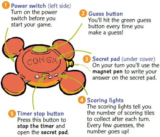 Close the cover on the secret pad to start the Conga timer. Pass the Conga timer to the player on your left. This person is the first guesser.