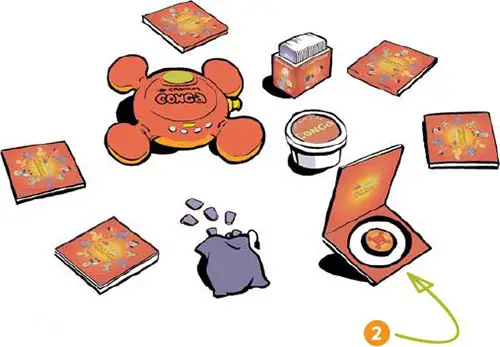 1 Set out the card deck, scoring tiles, Cranium Clay, and Conga timer.