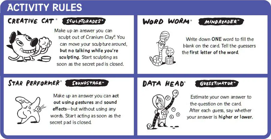 Start the activity. Follow the rules on the back page to help the other players guess your answer.