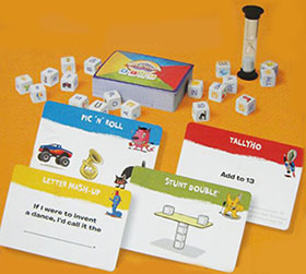 Use the letters on the dice to spell a word that completes the sentence on the card. The sentence must work grammatically, but can be as goofy as you like.