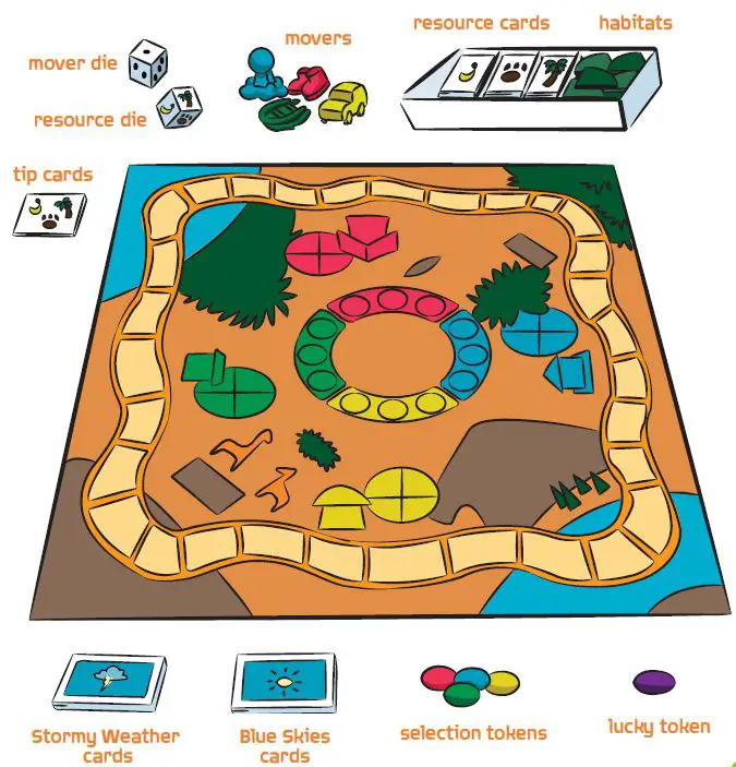 Set out the game board, tip cards, dice, movers, resource cards, habitats, lucky token, selection tokens, Blue Skies cards, and Stormy Weather cards.