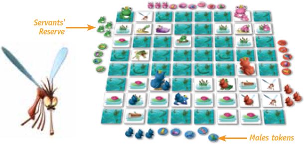 When one of your frogs lands on a Mosquito, you may move any of your other frogs. Then apply any effect for the tile on which your new frog lands. If you decide not to move another frog, your turn ends.