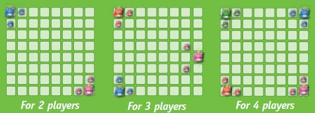 Then the players place their Queen and 2 Servants, depending on the number of players as indicated on the illustration below. Whoever jumps the farthest starts.