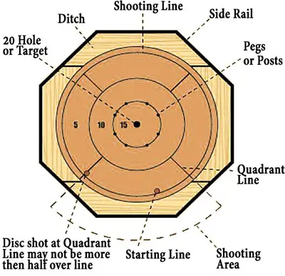 Board dimensions vary with a playing surface typically of polished wood or laminate approximately 27 inches in diameter. The arrangement is 3 concentric rings worth 5, 10, and 15 points as you move in from the outside. There is a shallow 20 point hole at the center. The inner 15 point ring is guarded with 8 small bumpers or posts.