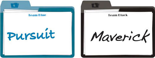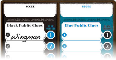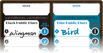 Team Black plays first. Their clue-giver must write one word on the Public Clue board. He chooses "WINGMAN", hoping to relate it to his private clue of "MAVERICK".