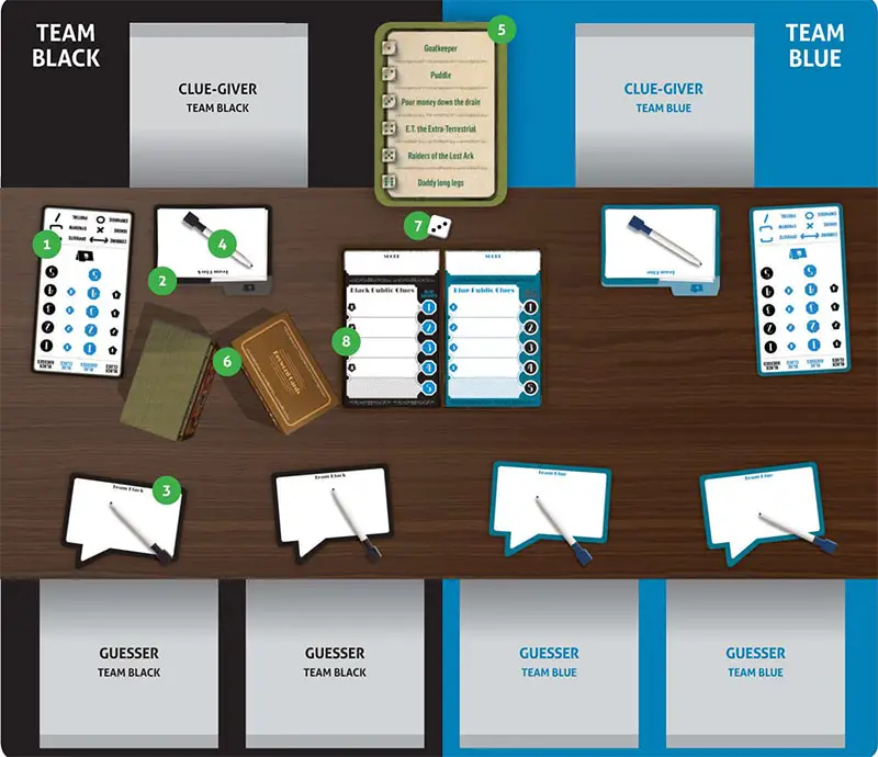 Each team chooses one player to be their clue-giver for the round. Both clue-givers sit on the same side of the table. The other teammates sit across from their clue-giver.