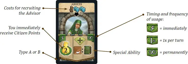 You receive Citizen Points as indicated on the card, immediately after Recruiting. Many Advisors grant special abilities: immediately and one-time, 1x per turn, or permanently. Using the Advisor's abilities is always optional.