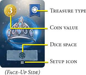 Collecting Treasure is the primary way of scoring Coins. The Coin values range from 1 to 4. There are six types of Treasure. By collecting sets of Treasure you can gain rewards from Collectors.