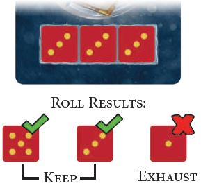 In this example, one die rolled less than its effort value of 3 and is exhausted.