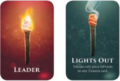 The player with the Lights Out card takes the last turn. When claiming on the last turn, you can only place Servants on one Treasure card. In a 2-player game, the Leader also has the Lights Out card and therefore gets a second turn to claim or recover.