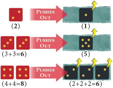 Subsequent players may claim unoccupied Treasure cards or push an opponent's Servants off of a card by placing dice with a higher total effort value. When pushing out Servants, remove all dice from the Treasure card and return them to their owner.