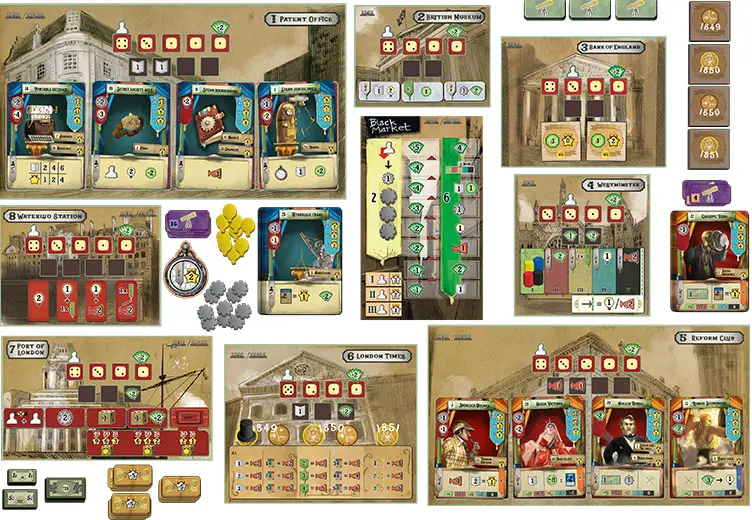 The game consists of 5 rounds (Spring and Autumn of 1849, Spring and Autumn of 1850, and Spring of 1851). The end of the game marks the start of the World Exhibition 1851.