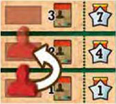 Example: Red places their 5 die on the dice placement space that shows a value of 3. Because of the Assistant symbol above the space, Red can im- mediately perform an Assistant action.