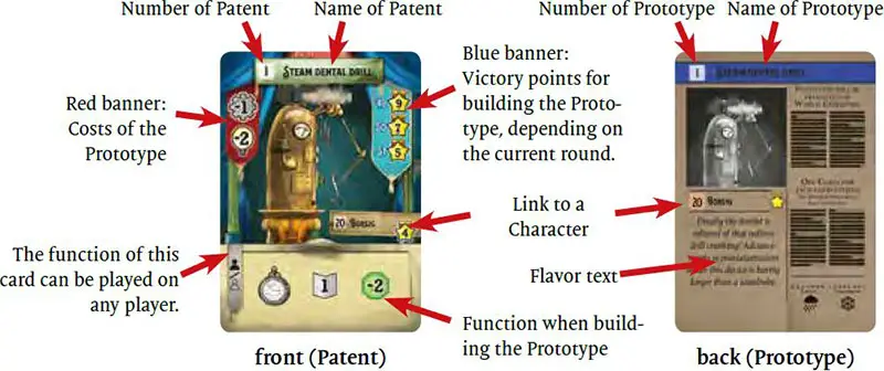 Beginning with the start player and continuing in player order, each player can convert their Patents into Prototypes. To build a Prototype, you need to pay the costs displayed in the upper-left corner on the red banner.