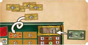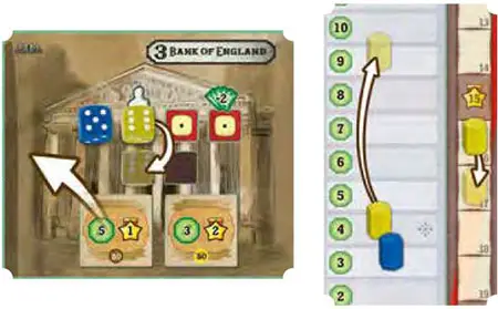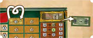 Receive income: You receive a number of pounds out of the supply according to the position of your player token on the income track. Should your token be placed on the space with the -1 victory point shown on the right, you lose 1 victory point.