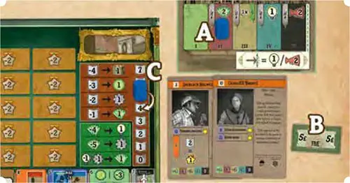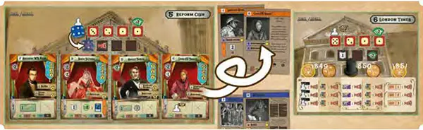 Band exchanges 1 newspaper into 1 poundCto avoid taking a loan. After that Blue can use the phase 4 abilities of their Character cards.For Holmes' ability (receive 1 victory point per 2 newspapers), Blue receives 2 victory points because Blue owns 4 newspapers.