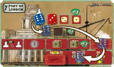 Take all your dice back, except the dice with a Ticket on the Port of London.