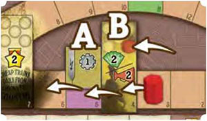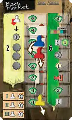 Example [black market]: All Assistants in the Black Market are moved one step down. An Assistant that was placed on the last step will be moved back into the players' supply.