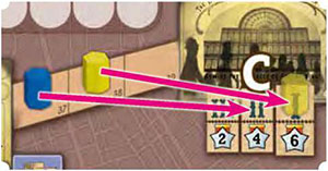 The first player who arrives at space 40, the end of the Buzz track C, places their player token onto space I, the next player onto space II, the player after that onto space III. (You will get the victory points on your entry Ticket at the end of the game.