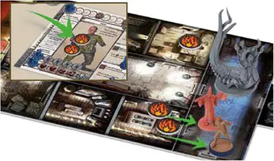 Ian has 3 successes to distribute as hits. He decides to use 2 to kill the Cultist, removing the figure and, using his Brawling skill, applies the last success as a hit to the Fire Vampire.