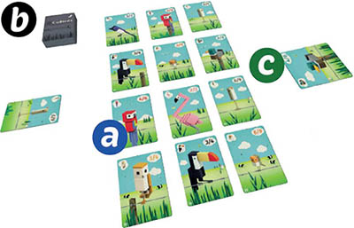 Then the dealer deals one Bird card to each player, faceup, which the players keep in front of them c: this is the first Bird in their collection. Keep enough free space next to the draw pile to form a discard pile.