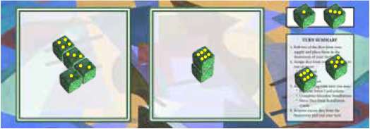Dice are placed in your Workroom to create Installations which may be used to complete an Installation Card.
