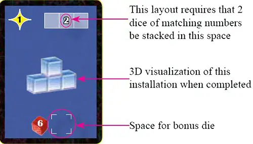 Place one die from your supply on each space shown on the Installation Card. These dice have the number values shown. (If more than one number value is shown, you may change it at any later time).