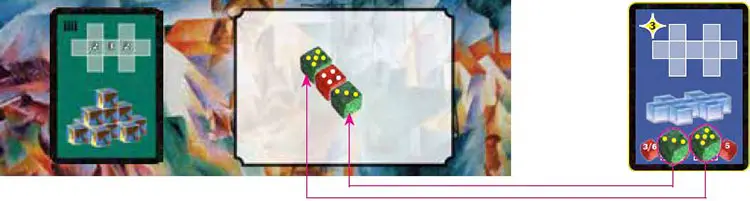 He can use these two dice, along with the 1 and 3 in the Storage Space, to add to the in-progress Installations in the Workrooms to the left. Identical numbers stack; numbers 1 higher or 1 lower go adjacent to other dice.