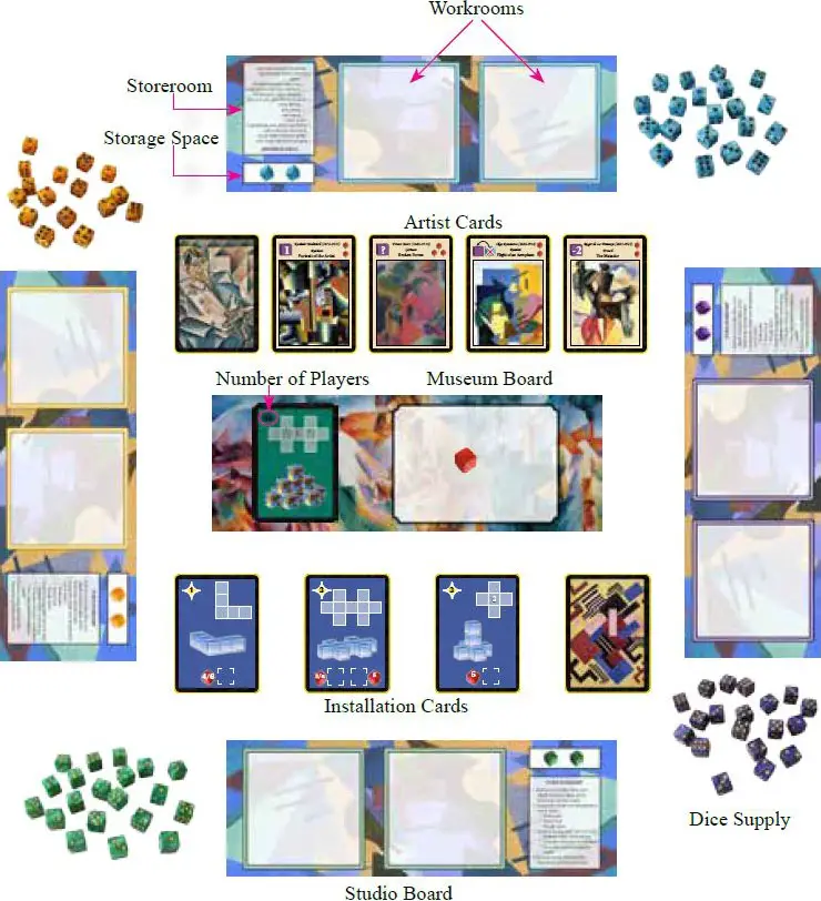 Drawing from the top of this deck, display four face-up Artist Cards to the right of this deck as shown in the Setup Diagram.
