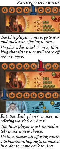 In the playing order, each player chooses a God and places his offering marker on the space corresponding to the offering that the player wishes to make to that God.