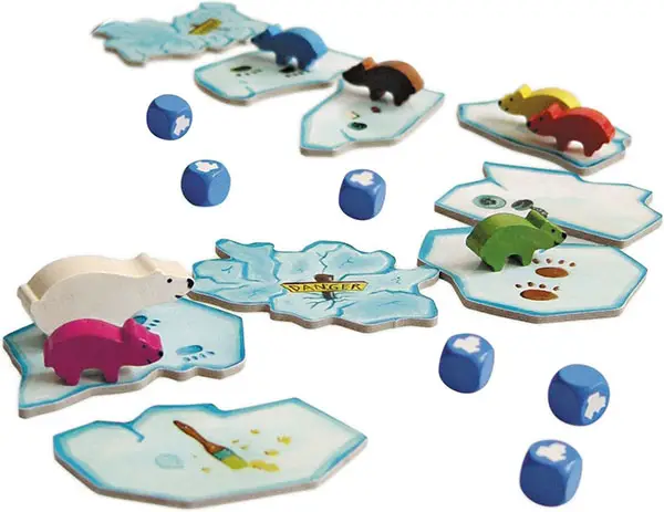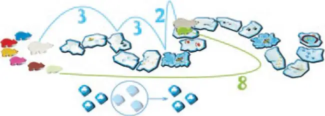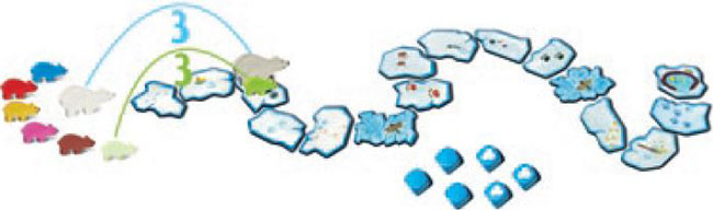 As soon as there are at least two ice floes behind the last bear cub, these floes are taken away. The first ice floe gets put back in the game box, while the others are laid between the next to the last ice floe and the floe with the wash tub.
