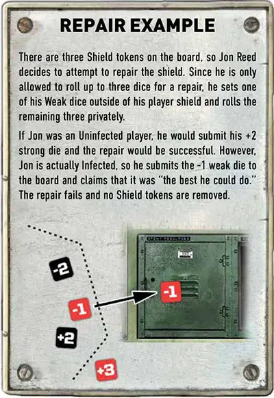 There are three kinds of repair actions. When attempting a repair, the player rolls up to three of their dice and submits one (they may roll fewer than three dice, although this will reduce their chances of success greatly).