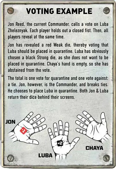 A player may call a vote to either 1) quarantine a player or 2) release a player from quarantine (a player may call a vote on themselves). All players then hold out a closed fist and simultaneously reveal what they've concealed inside.