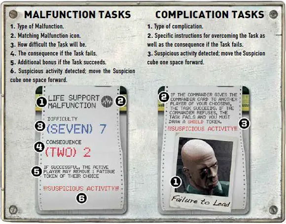 Malfunctions come in four different types and will require players to collectively roll their dice in an attempt to fix the malfunction (or, in the case of the Infected players, possibly cause everyone to fail). Complications feature an illustration and require the player or players to make a choice of some kind.