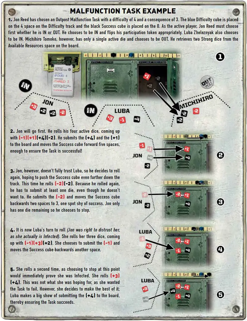 - Choose whether they are IN or OUT during Malfunction Tasks and submit dice as normal. Passing during a Malfunction Task still lets the Infected player take up to two dice from the Available Dice pool.