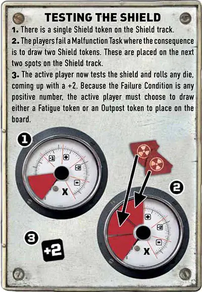 If the result matches the Failure Condition, the shield test has failed and the active player must choose to either 1) draw a Fatigue token or 2) draw an Outpost token.