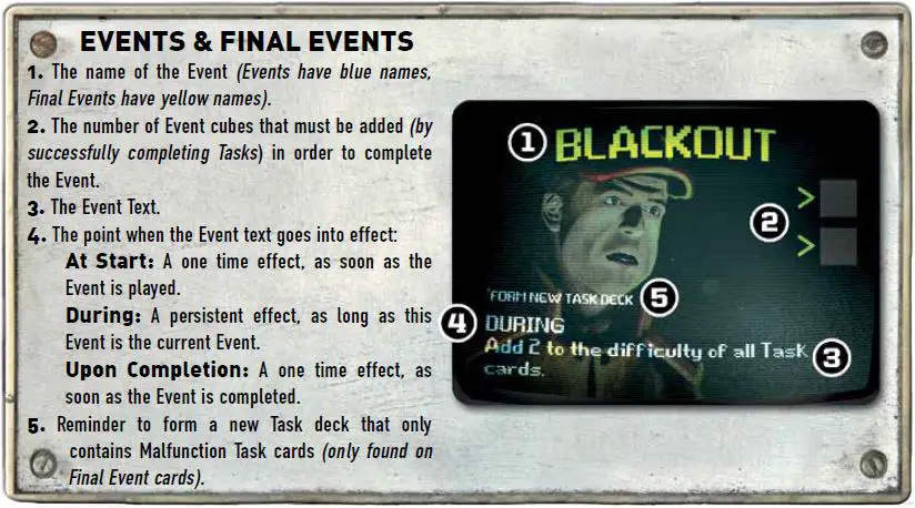 When the Final Event begins, take all remaining and discarded Task cards, remove all Complication Tasks, and place them back in the box; they will no longer be used. Shuffle and form a new Malfunction-only Task deck with the remaining cards.