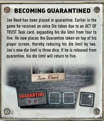 When a player is placed in quarantine, place a Quarantine token in front of their player screen, covering up two of their die icons. Their die limit is now reduced by two dice. If that player has more active dice behind their screen than their current die limit allows, they must discard the extra dice to the Available Resources pool.