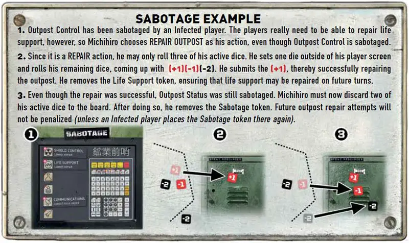 Place the Sabotage token on top of the Shield Control, Outpost Status, or Life Support label on the board. Any player attempting to repair that area rolls and submits a die normally. Afterward, whether they succeeded in repairing or not, they must discard two dice to the board, thereby removing the Sabotage token. If they do not have two dice, they discard as many as they can.