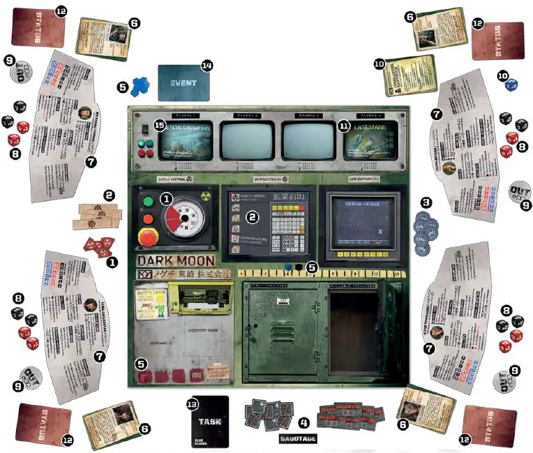 Place the Sabotage, Die, and Quarantine tokens next to the board.