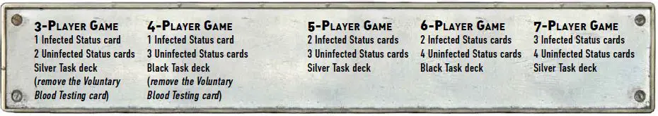 Depending on how many players you have, consult the chart on the bottom of the page to determine how many Uninfected and Infected Status cards you'll need in the game, as well as which deck of Task cards to use.