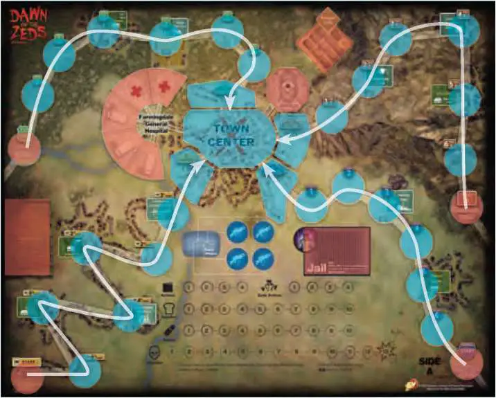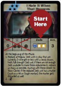 Move the Zeds unit or Zeds Mob with the highest Strength one space closer to Town Center. If it cannot move, pick the strongest Zeds unit or Zeds Mob that can move. If this is tied, move the one that is already closest to Town Center. If this is tied, it is your choice which of the tied spaces to activate.