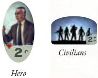 - If the result is a 4, 5, or 6, immediately place it in Town Center: on its reduced-strength side if it is any Civilians unit; on its full-strength side if it is a Hero unit.