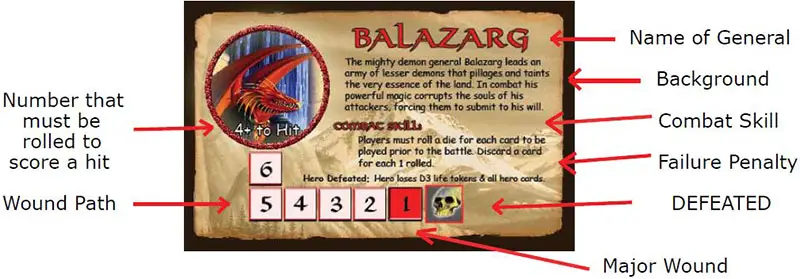 Note: Multiple hits are required to defeat Generals and players should not attack a General unless they have a good chance of success because the penalties related to failure can be crippling. Additionally, success against the Generals often requires that more than one hero attack the General at the same time.