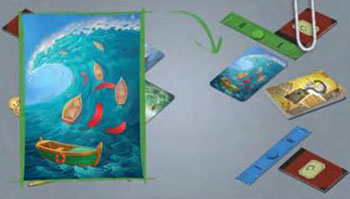 Example: Jane is the Conspirator. There is nothing on her notebook. She tries to analyze the two previous cards and looks for something that could fit in. There is water on both cards - maybe the word is "water "? She chooses a card with a big blue wave.