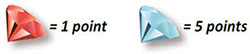 Precious Stones are represented by Rubies worth 1 point and Diamonds worth 5. Only Rubies can be found in the cave, but you can exchange five Rubies for one Diamond at any time.