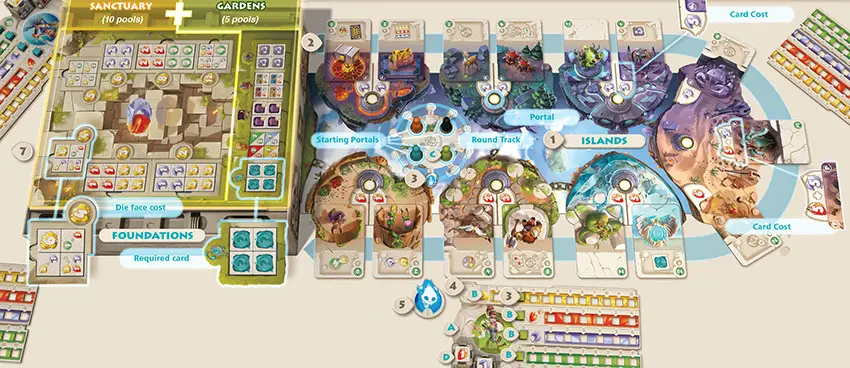 The active player takes one or more strictly different die faces from the Sanctuary, spending the required for each face acquired.