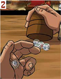Simultaneously, the players each shake their 5 dice in their cup. The cups are fl ipped over towards the table keeping the dice hidden.